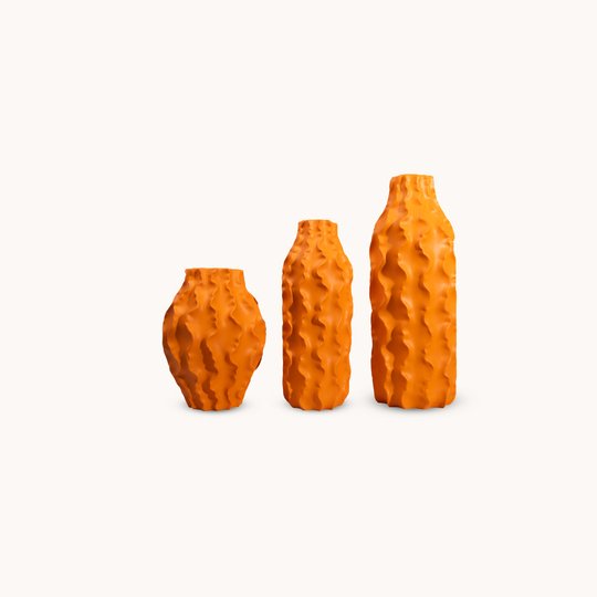 Bu set genellikle üç farklı boyutta ve şekilde vazodan oluşur, hepsi de aynı renkte turuncu tonlarda tasarlanmıştır.