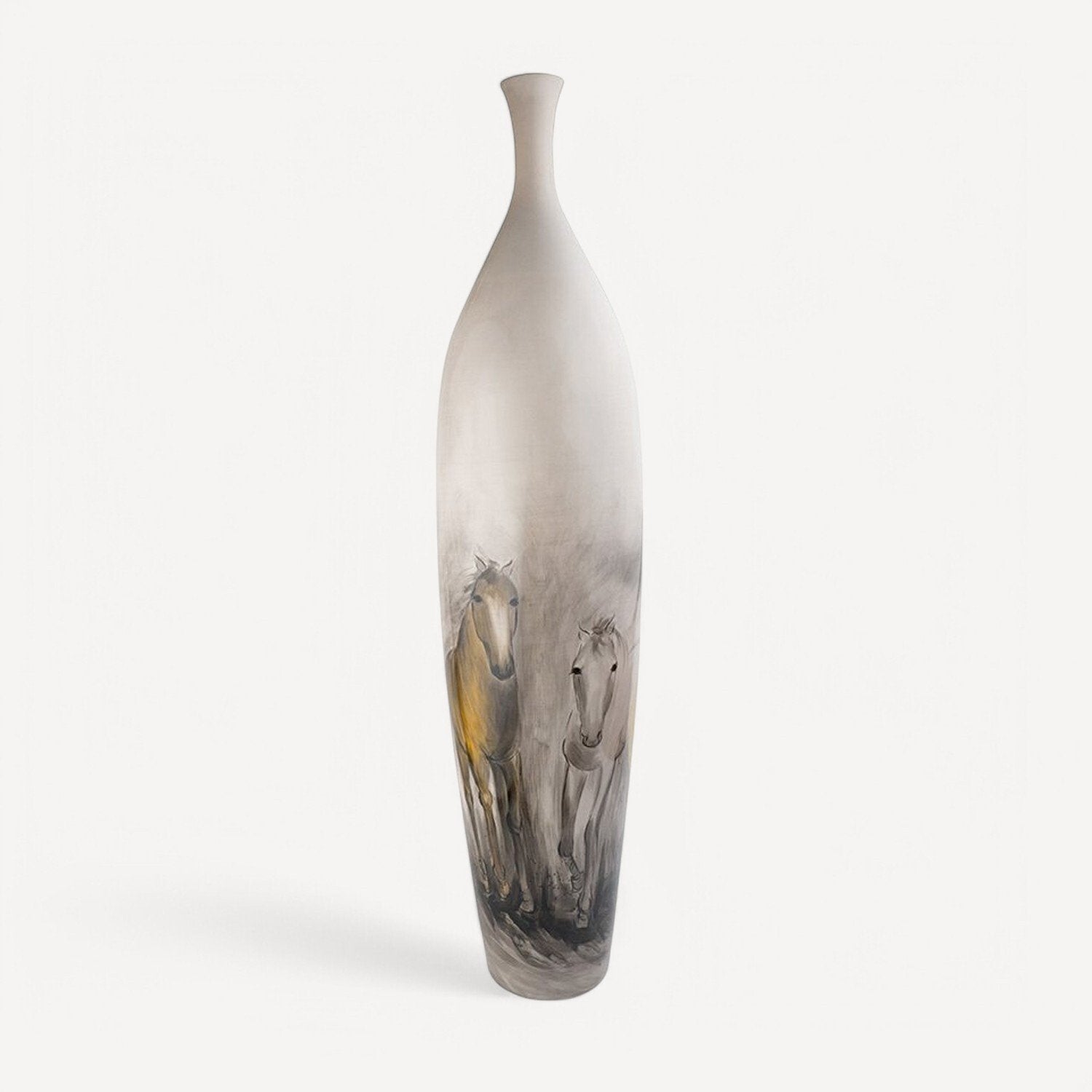 İnce ve zarif siluetiyle dikkat çeken bu Forest İnce Ağızlı Büyük Vazo, sanatsal dokunuşu ve doğadan ilham alan tasarımıyla öne çıkıyor. Üzerindeki el işçiliğiyle boyanmış at figürleri, hareket ve özgürlüğün sembolü olarak mekâna dinamik bir hava katıyor. Mat ve geçişli renk tonlarıyla modern bir görünüm sunarken, el yapımı detayları sayesinde benzersiz bir estetik yaratıyor.