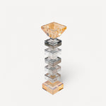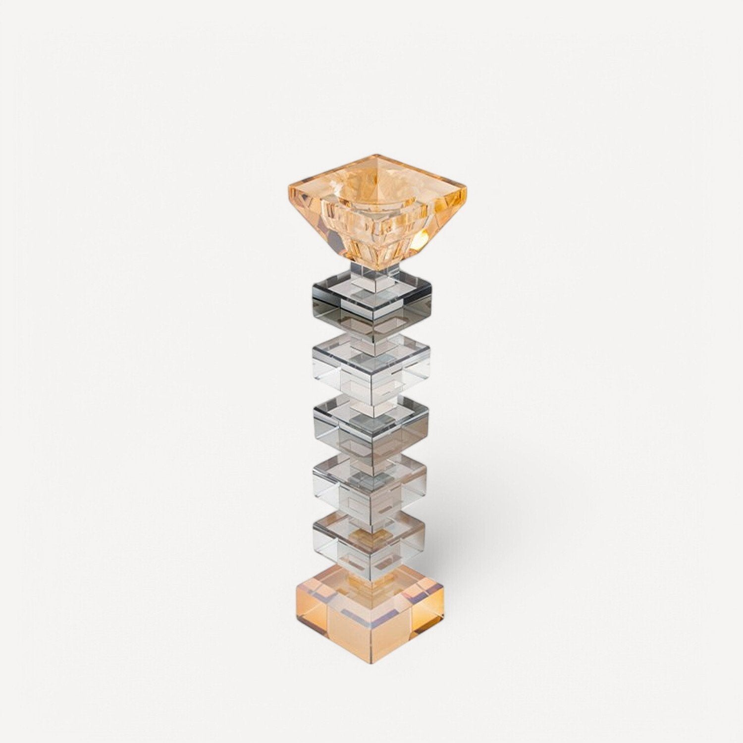 Modern ve geometrik tasarımıyla dikkat çeken bu Büyük Boy Cam Mumluk, füme ve amber tonlarının zarif geçişiyle göz alıcı bir dekoratif obje sunuyor. Üst üste dizilmiş kristal kesimli blok detayları, ışığı büyüleyici bir şekilde yansıtarak mekâna sıcak bir atmosfer katıyor. Kaliteli cam malzemesi ve ince işçiliğiyle uzun ömürlü bir kullanım sunar.