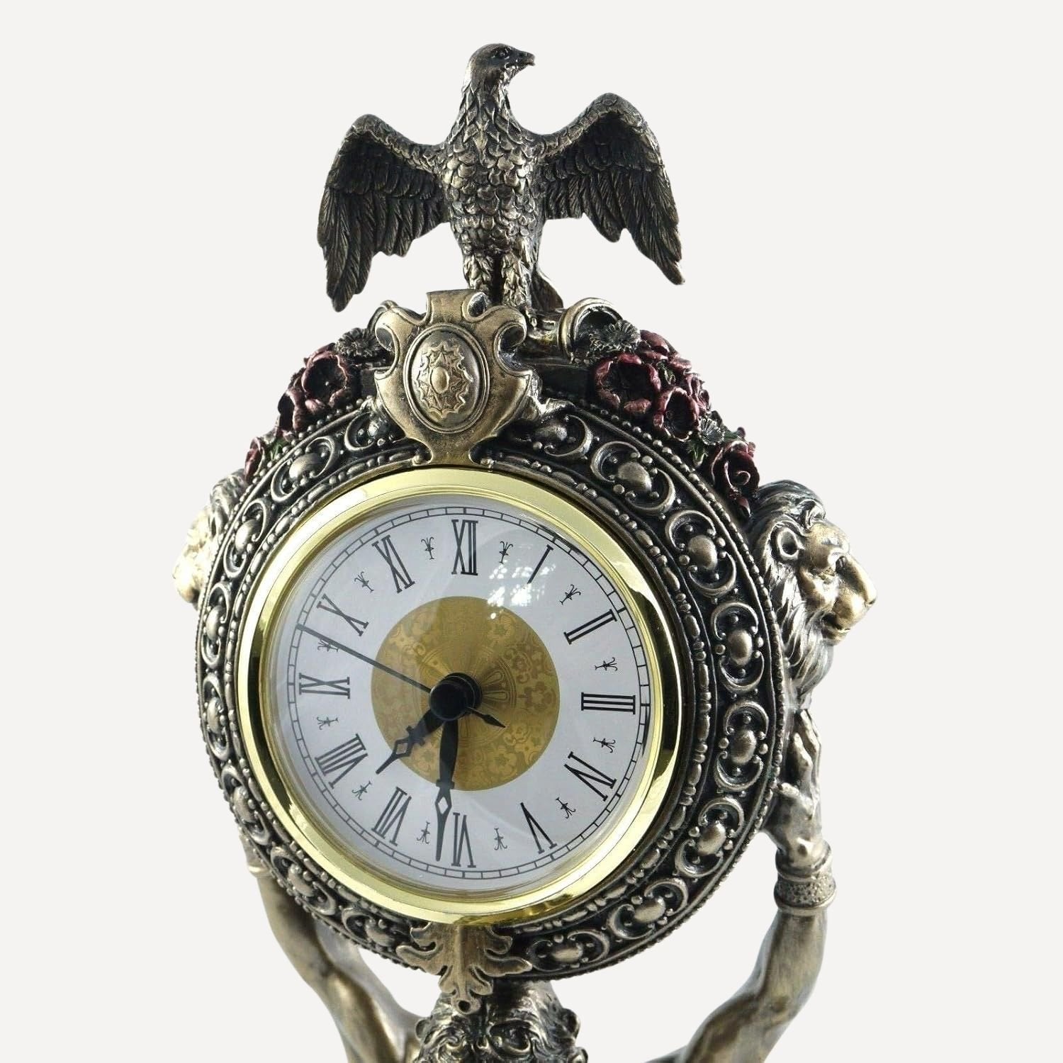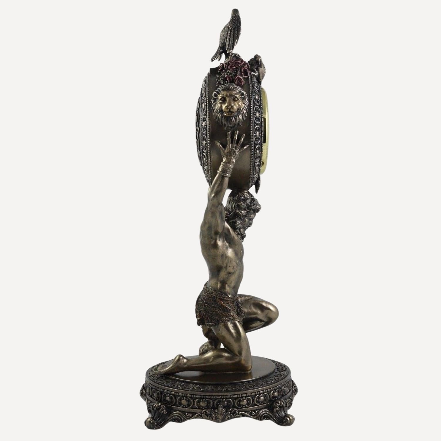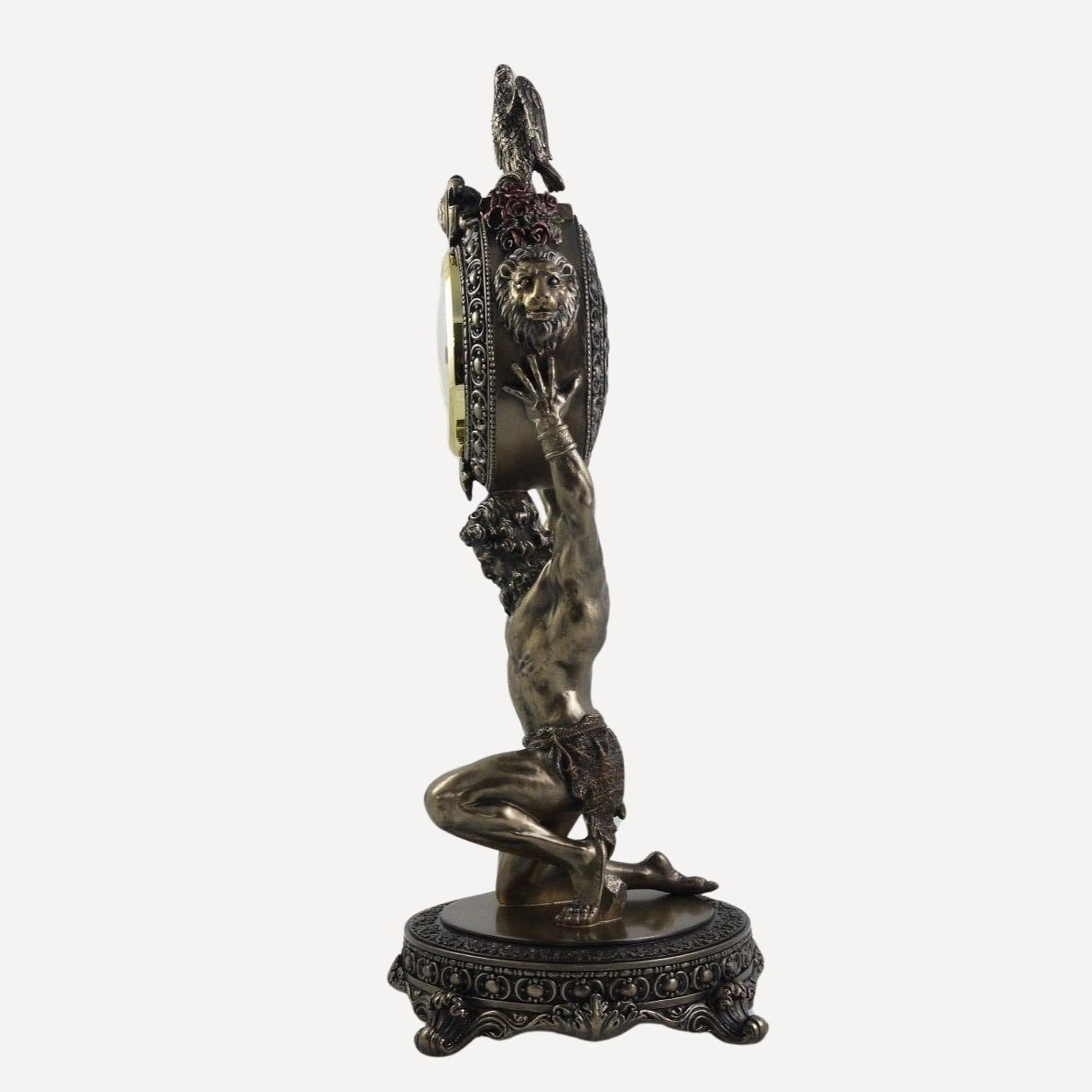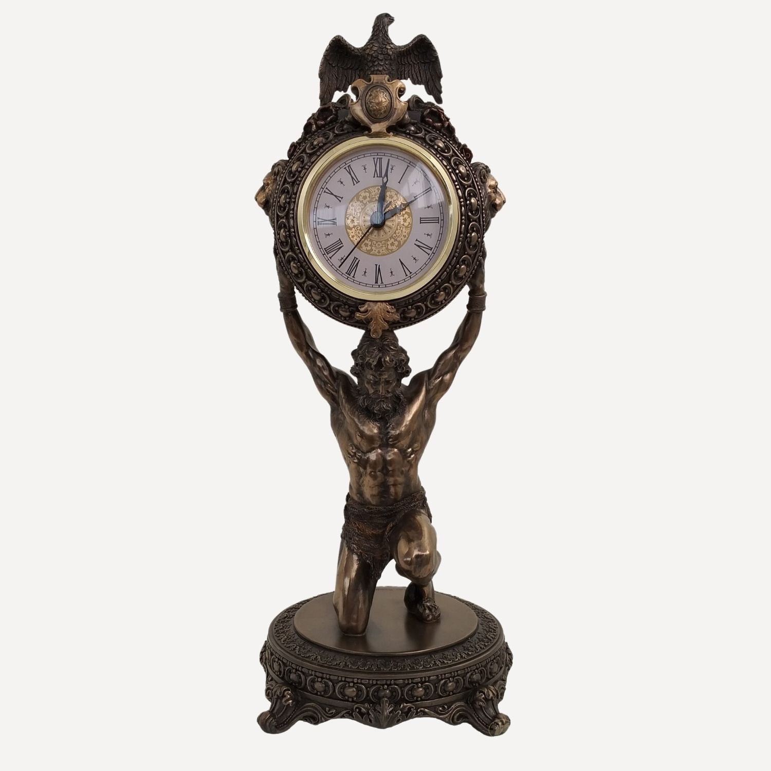 Zamanı güçlü ellerinde taşıyan Atlas figürü, mitolojik estetik ve klasik zarafeti bir araya getiriyor. Bronz efektli detayları, Roma rakamlı kadranı ve ince işçiliğiyle bu masa saati, antika severler ve klasik dekorasyon tutkunları için benzersiz bir parça niteliğinde.