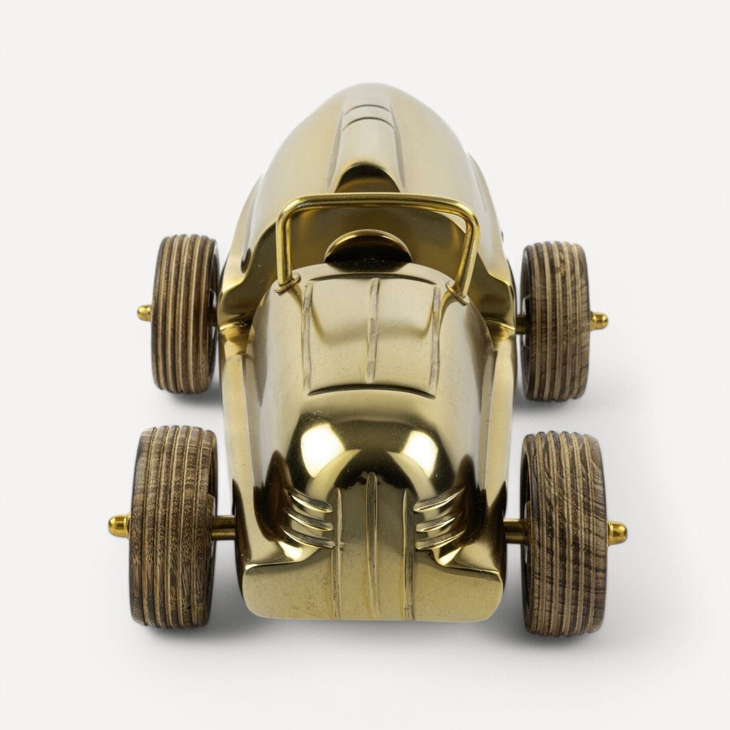Mekânınıza nostaljik bir dokunuş ve sofistike bir atmosfer kazandırmak istiyorsanız, Altın & Ahşap Dekoratif Klasik Araba tam size göre! İkonik klasik yarış arabalarından esinlenerek tasarlanan bu eşsiz obje, geçmişin zarafetini günümüz modern dekorasyon anlayışıyla buluşturuyor. Parlak pirinç kaplama gövdesi ve ahşap tekerlek detayları, sadece görsel olarak değil, dokunsal olarak da üst düzey bir deneyim sunuyor.