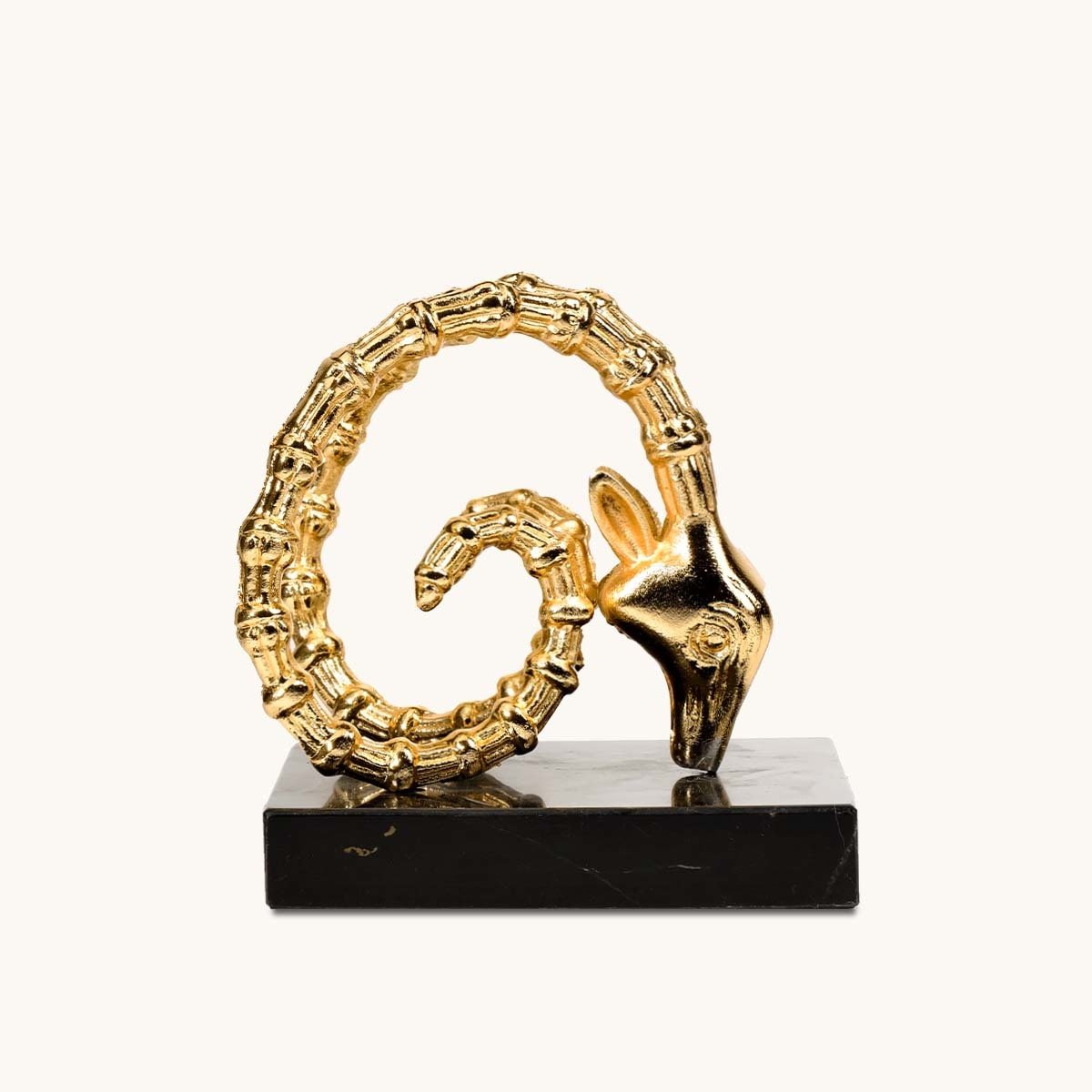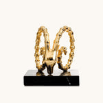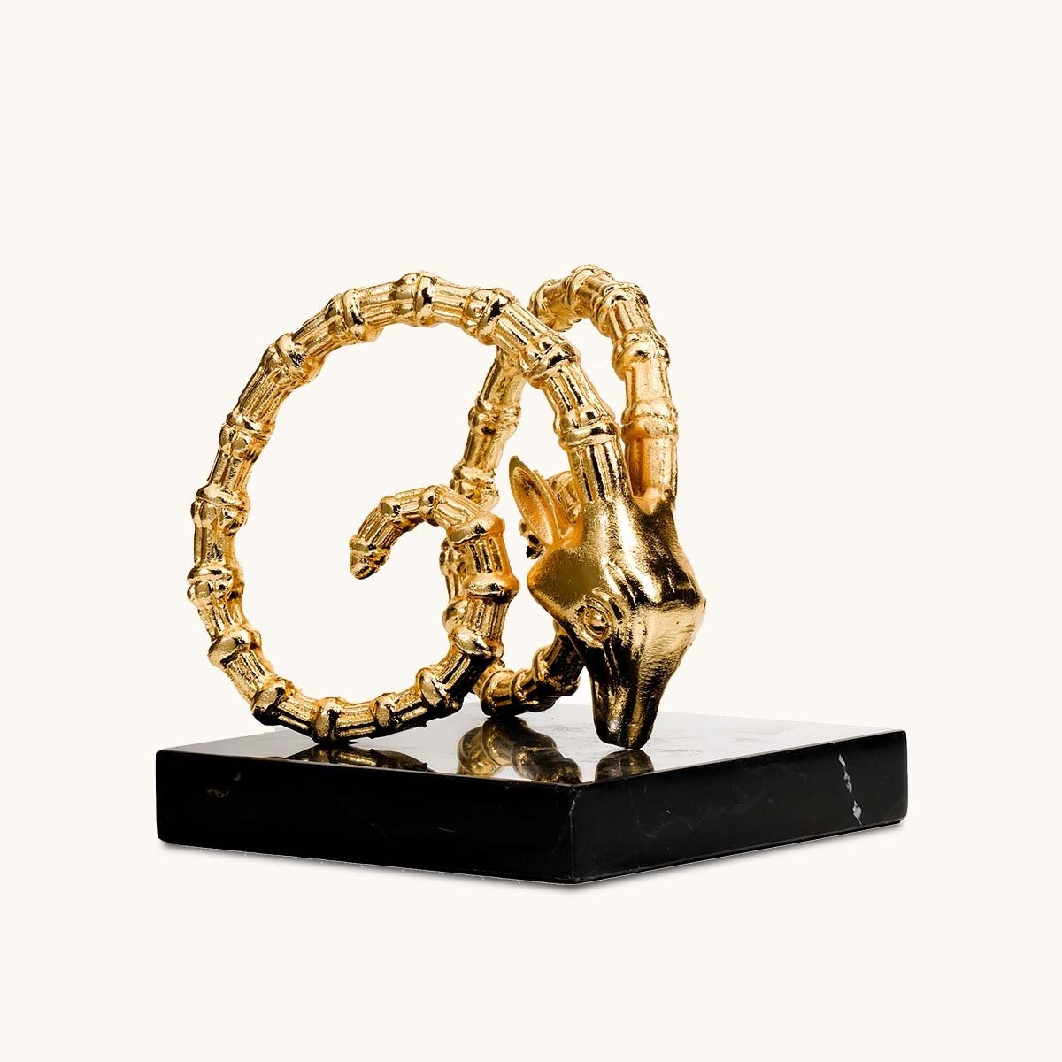 Mitolojik ve doğal sembollerden ilham alınarak tasarlanan bu kitap tutucu, koç başı figürüyle gücü, liderliği ve dayanıklılığı temsil eder. Altın rengi metal iskeletiyle dinamik bir form kazanan heykel, siyah mermer tabanı ile kontrast oluşturarak sofistike ve lüks bir görünüm sunar.