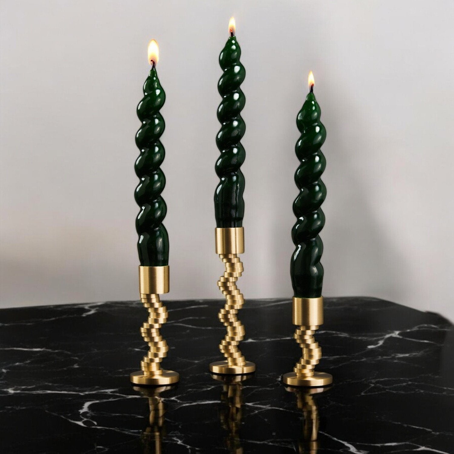 Modern tasarımıyla öne çıkan Pirinç Şamdan Seti, spiral formdaki gövdesiyle estetik ve dinamizmi bir araya getiriyor. Farklı boylardaki üç parça, masa veya raf üzerinde görsel derinlik oluştururken, pirincin sıcak tonları ortama zarif bir ışıltı katar. Masif yapısı sayesinde dengeli bir duruş sunar ve uzun ömürlü kullanım sağlar. Özel gün sofraları veya şık mekanlar için hem fonksiyonel hem de dekoratif bir seçenektir.