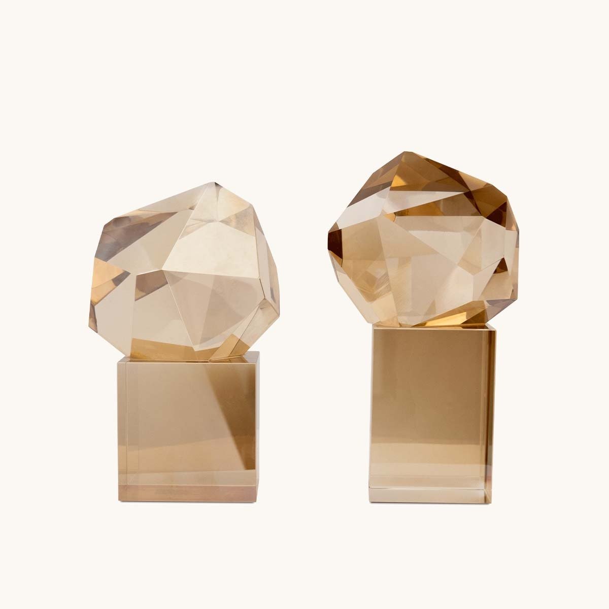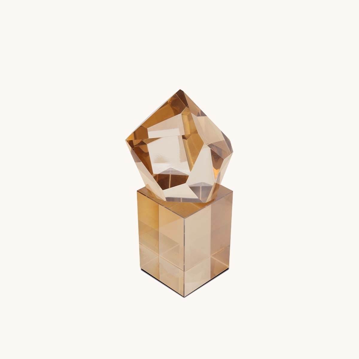 Elmas kesim detayları ve şampanya tonundaki zarif cam dokusuyla tasarlanan bu dekoratif obje seti, iç mekanlara lüks ve sofistike bir atmosfer katıyor. Işığı kusursuz bir şekilde yansıtan çok yüzeyli formu, hem modern hem de klasik dekorasyonlarla uyum sağlayarak mekana estetik bir derinlik kazandırıyor.