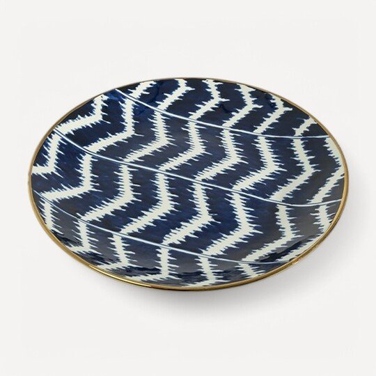 Hazel Serisi’nin zamansız şıklığını yansıtan bu özel tasarım tabak, mavi ve beyazın sofistike uyumunu taşıyan benzersiz deseni ve altın detaylarla çerçevelenmiş zarif formu ile dikkat çekiyor. El işçiliğiyle hazırlanan bu dekoratif tabak, sanatı ve estetiği yaşam alanlarına taşıyan şık bir obje olma özelliğine sahip.