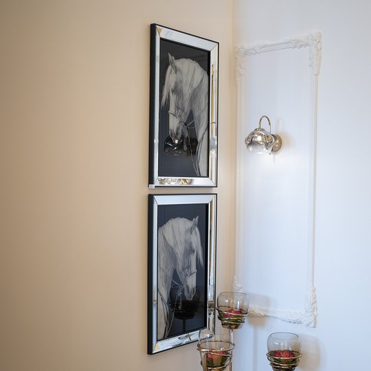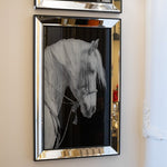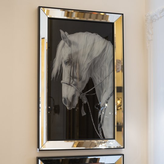 Asaletin ve özgürlüğün simgesi at figürü, bu özel tasarım tablo ile yaşam alanlarınıza sofistike bir dokunuş katıyor. Siyah fon üzerindeki beyaz at illüstrasyonu, derinlik hissi yaratan ayna detaylarıyla tamamlanarak, ortama şık ve modern bir hava kazandırıyor.