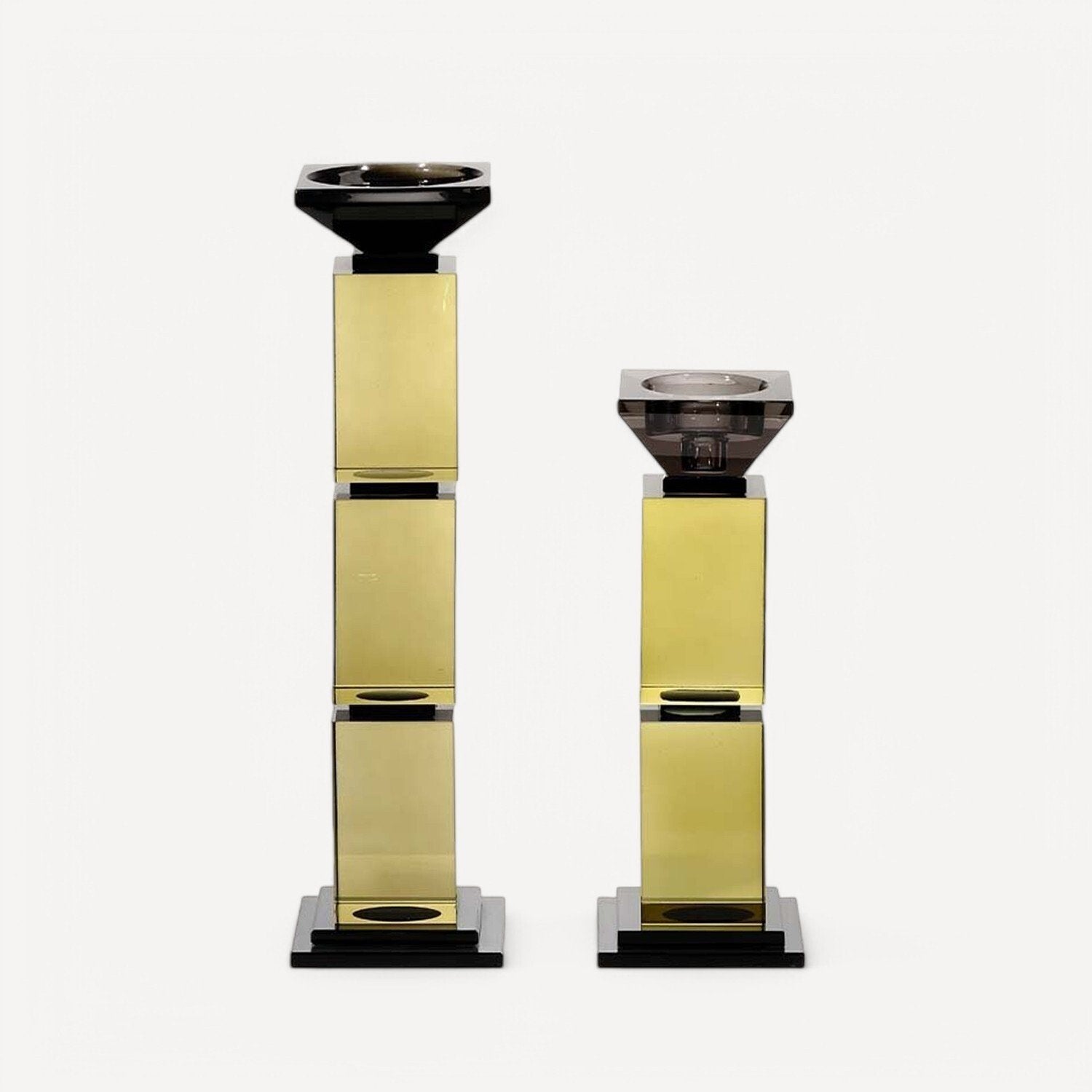 Minimalist ama etkileyici tasarımıyla öne çıkan bu set, dikdörtgen formlu altın rengi cam blokları ve siyah detaylarıyla klasik ve modern dekorasyon anlayışını bir araya getiriyor. Üst bölümde yer alan füme cam hazne, mum ışığını yumuşak bir şekilde süzerek romantik ve sıcak bir ambiyans oluşturur.