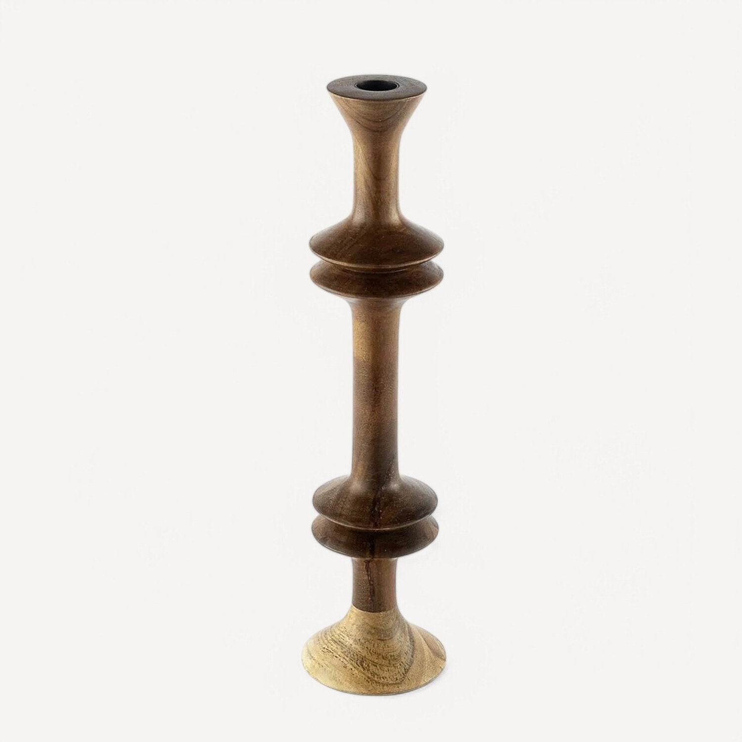 Şık ve dengeli siluetiyle klasik mumluk formlarına modern bir dokunuş kazandıran bu tasarım, zamansız çizgileri sayesinde her dekorasyon stiliyle mükemmel uyum sağlar. İnce işlenmiş detayları, dekoratif şıklık sunarken, ahşabın doğal damarlı yapısı her parçayı benzersiz kılar.